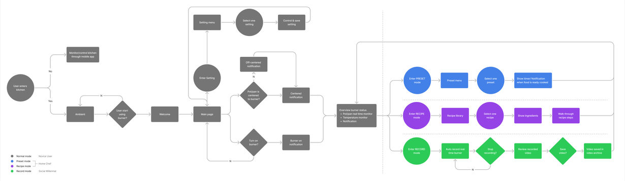 Drawing inspiration from our created persona, the team followed their cooking flow and found distinctive routes: accident prevention, guided assistance, recipe following, and recording and sharing personal cooking videos.